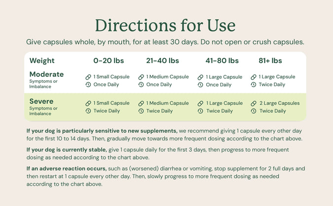 If your dog is particularly sensitive to new supplements, we recommend starting by giving just 1 capsule and waiting 3-4 days before giving the next one. Then, you can gradually move towards more frequent dosing.